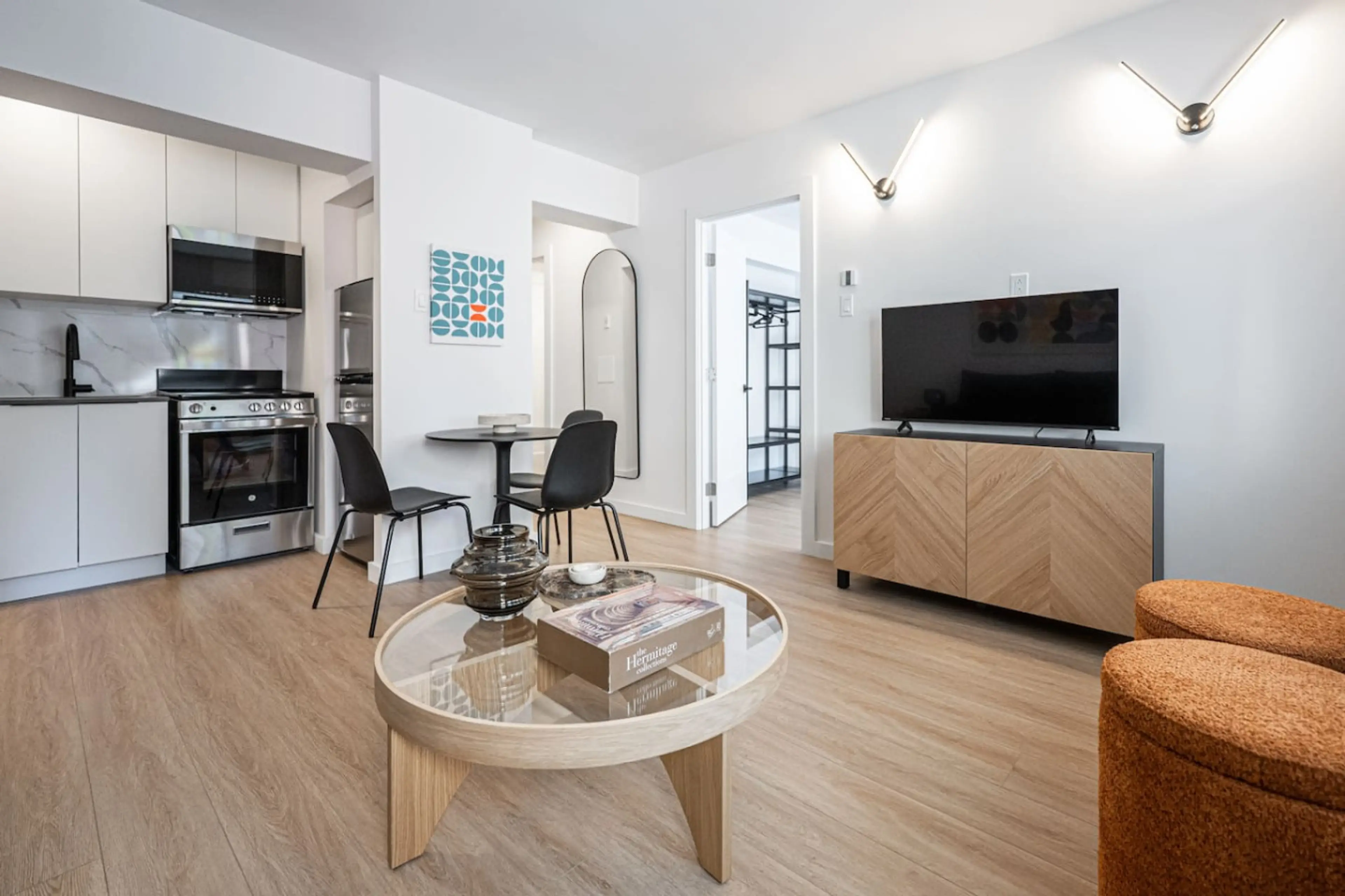 Modern 1BR in downtown Montréal with balcony, fast WiFi, smart TV, desk, full kitchen, and shared laundry. Sleeps 4 (double bed + queen sofa). On-site parking ($, book ahead). Pet-friendly, no extra fees. Walk to McGill, Concordia, Old Montréal, Bell Centre, and metro. Ideal for 31+ night stays: wor...