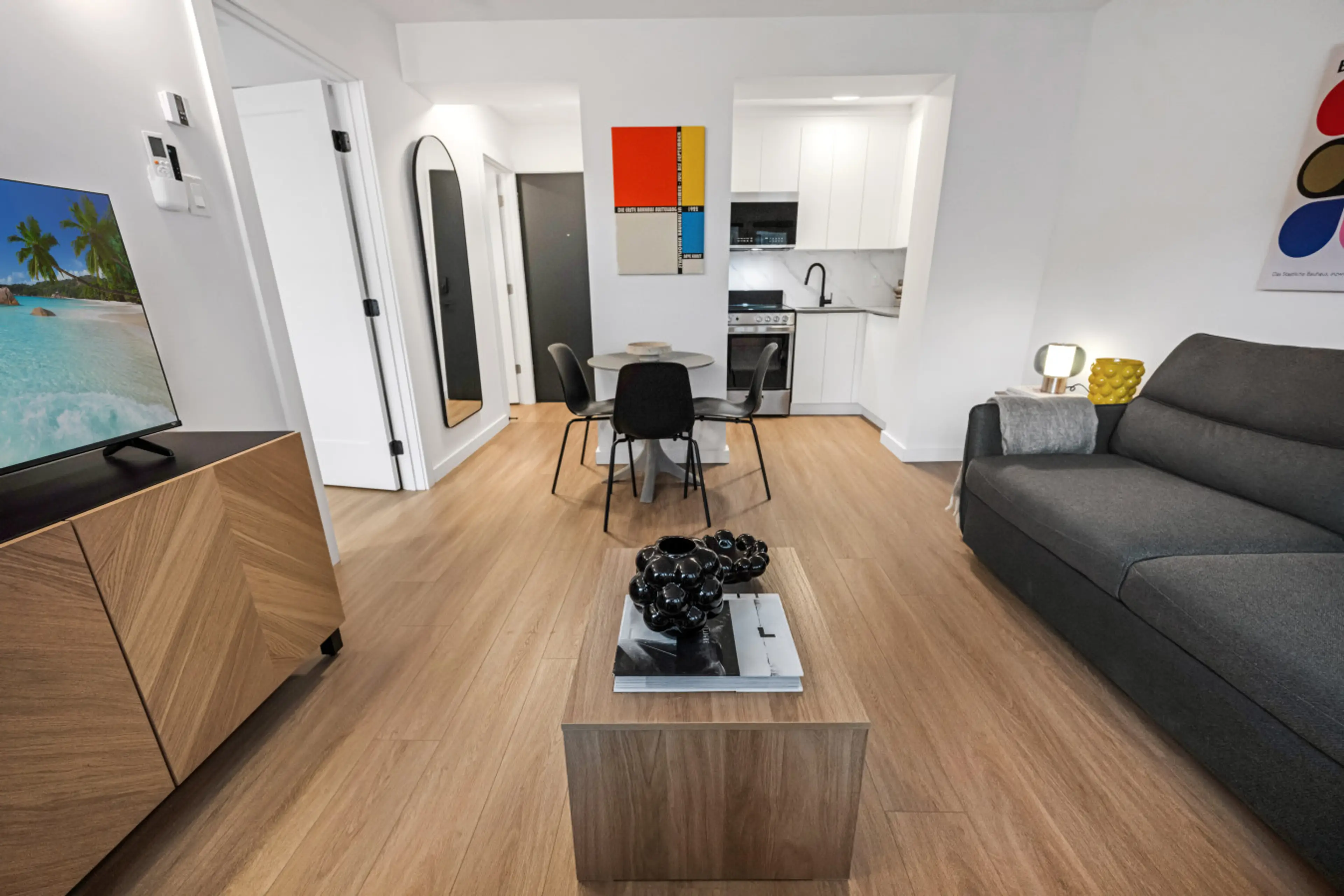 Step into BauHaus Montreal—inspired by iconic Bauhaus where art meets function. Our sleek downtown spacious 1BR features minimal lines, warm textures, and bold geometric prints sparking creativity—ideal for remote work, escapes, extended stays, furnished rentals. Perfect for pros, relocations, long-...