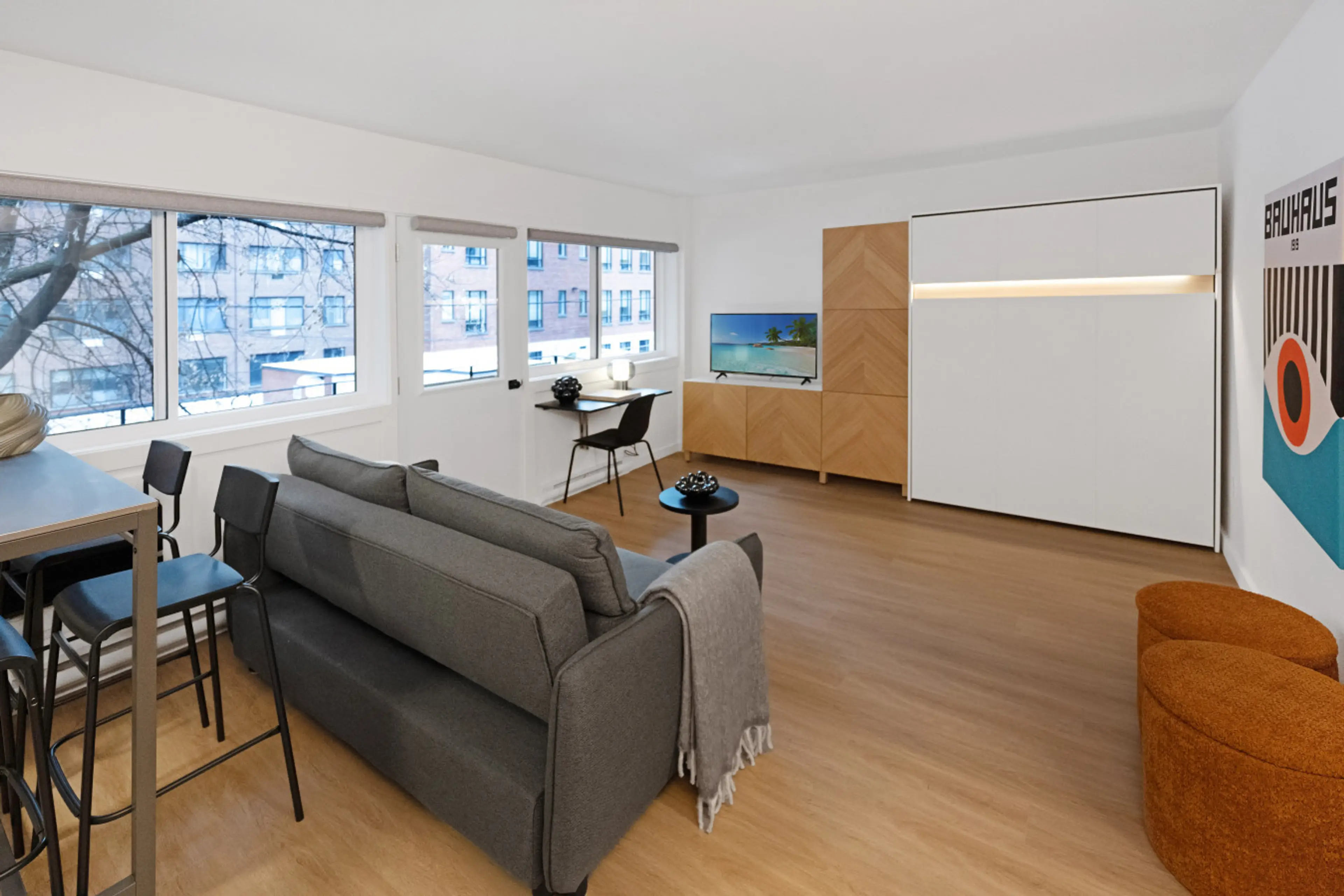 Step into BauHaus Montreal—where Bauhaus design meets modern comfort. This spacious downtown loft features clean lines, warm textures, and a premium queen Murphy bed plus a bonus queen sofa bed—sleeping up to 4 guests. Perfect for remote work, relocations, extended stays, and furnished monthly renta...
